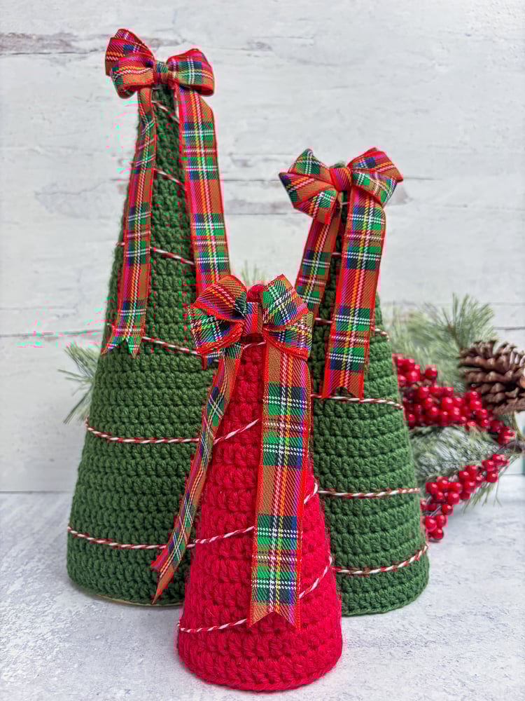 Free Crochet Christmas Tree Patterns in 3 Sizes (Large, Medium & Small) with Wooden Bases